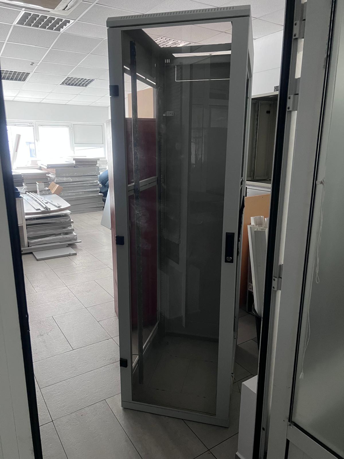 Практичен метален шкаф със стъклена врата, подходящ за офис, архив, склад или техническо помещение. Подходящ за подреждане и съхранение на документи, техника и други материали.