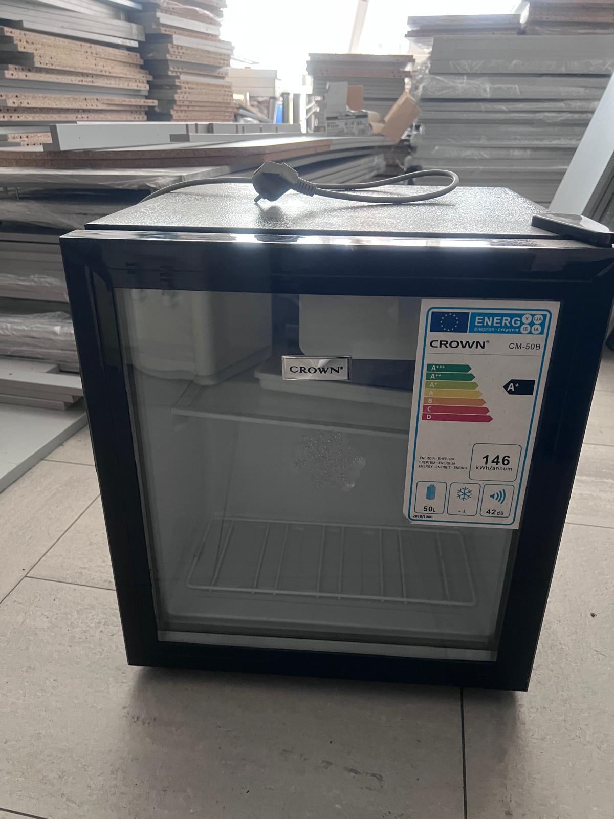 Компактен мини хладилник Crown CM-50B, подходящ за офис, хотелска стая, кухня, студио или малко помещение. Практично решение за съхранение на напитки и хранителни продукти при ограничено пространство.