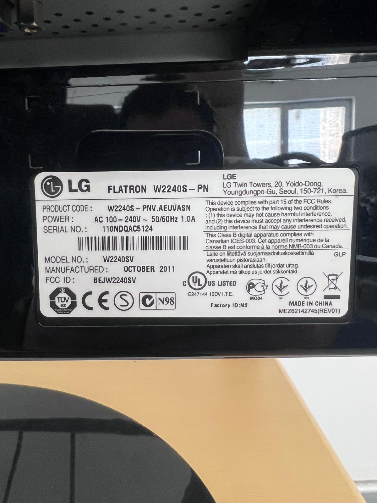 Монитор LG Flatron W2240S-PN, модел W2240SV, в добро визуално състояние. Мониторът е подходящ за офис работа, интернет, обучение, видеонаблюдение или като втори екран. Дизайнът е изчистен, с черен гланцов корпус и стабилна оригинална стойка.Моделът е произведен през октомври 2011 г. Захранване AC 100–240V, 50/60Hz, 1.0A. Има нормални следи от употреба според годините, видими по корпуса. Подходящ избор за ежедневна работа на достъпна цена.