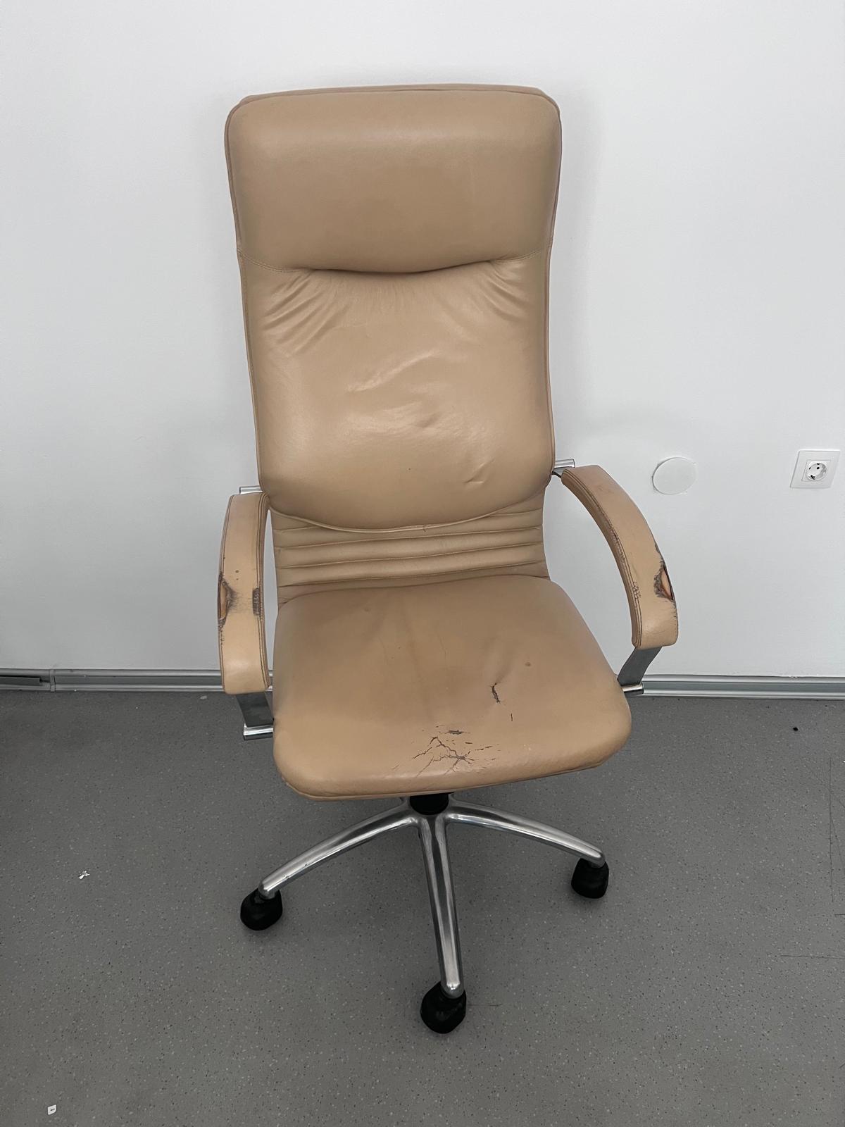 Удобен офис стол с висока облегалка, мека седалка и подлакътници. Подходящ за офис, кабинет или домашно работно място. Има видими следи от употреба по седалката и подлакътниците.