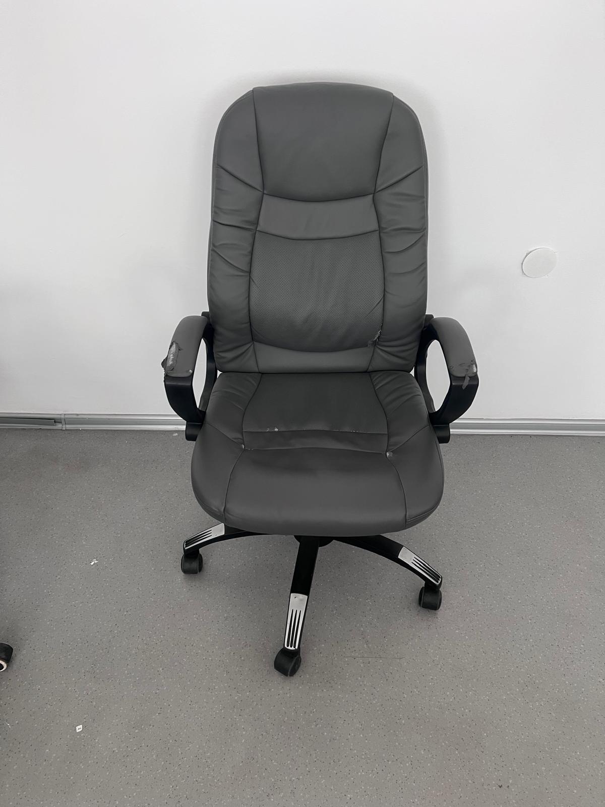 Офис стол с висока облегалка, удобна седалка и подлакътници. Подходящ за бюро, офис или домашен кабинет. Има нормални следи от употреба и леки забележки по подлакътниците.